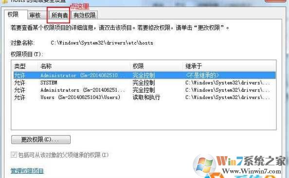 3、Windows7旗舰版在高级安全设置界面,切换到【所有者】选项卡;