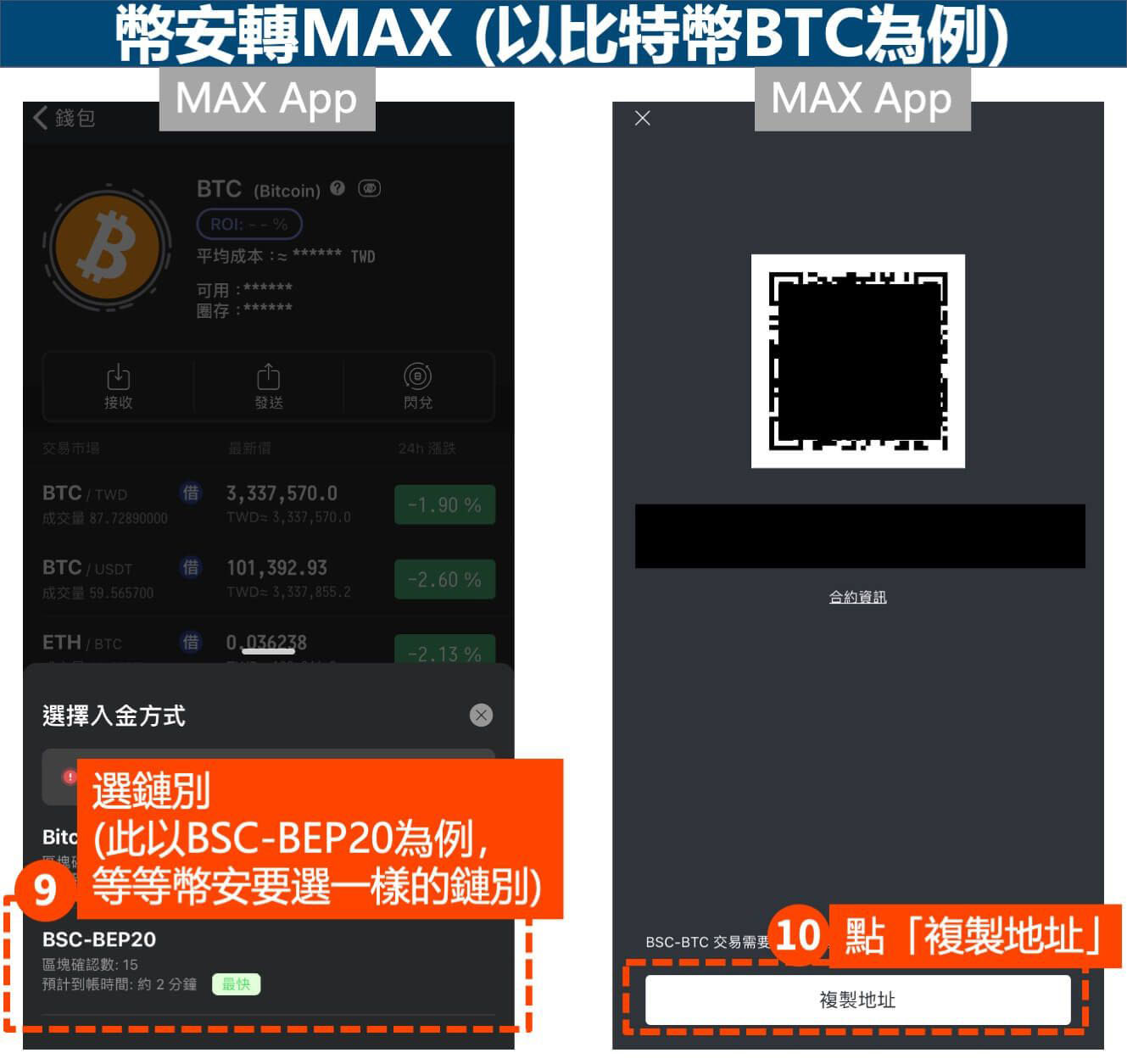 - 步骤二:从币安出金加密货币到MAX → 例如把币安帐户里的比特币转到MAX