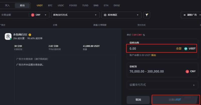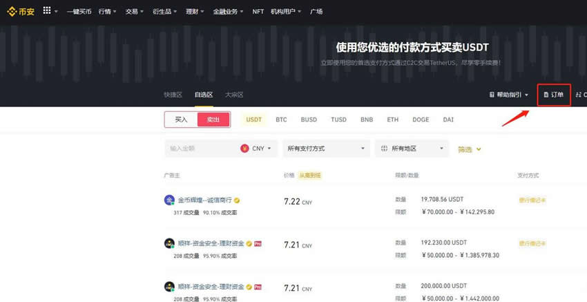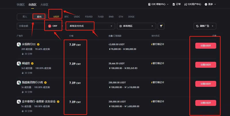11、根据提示选择“自选区”——“卖出”——“CNY”可以点击所有支付方式筛选支付方式,而后点击“出售USDT”即可