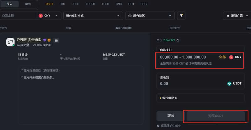 7、在弹窗中输入购买USDT数量,再次点击“购买USDT”即可