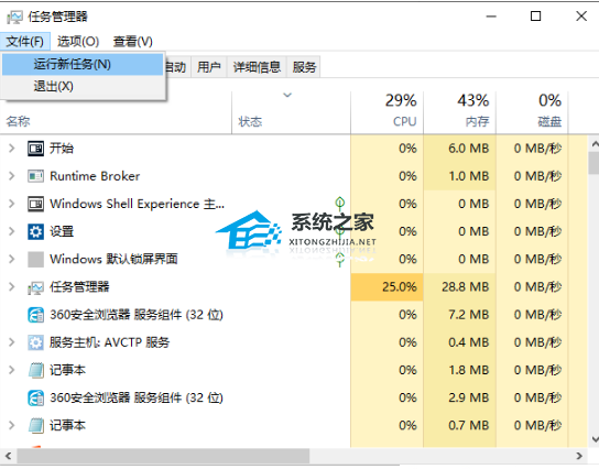 2. 打开任务管理器页面,点击左上角的【文件】,下拉菜单中点击【运行新任务】。