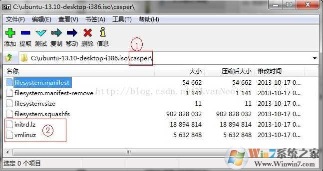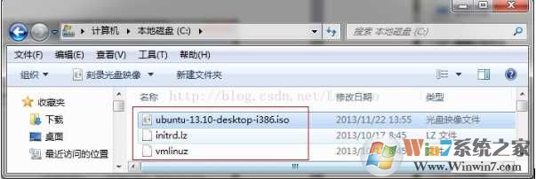3. 将ubuntu系统镜像拷贝到C盘根下。把ubuntu系统镜像文件中casper目录下 initrd.lz vmlinuz (13.10中64位:vmlinuz.efi)拷贝出来放到C盘根下(13.10中64位的vmlinuz.efi改名为vmlinuz)。