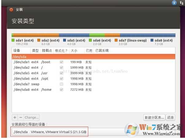 10. 根据自己系统的具体情况进行分区。如果由ubuntu启动引导win7,则安装启动引导器的设备可以不用更改,默认即可。如下所示: