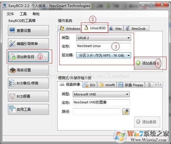 13. 运行EasyBCD,"添加新条目"->"Linux/BCD"。