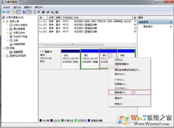 2. 假如要将F盘所在分区用来安装ubuntu,则把该分区从win7中删除。如下图所示: