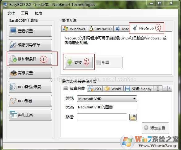 4. 运行EasyBCD,"添加新条目"->"NeoGrub"->"安装"。如下图: