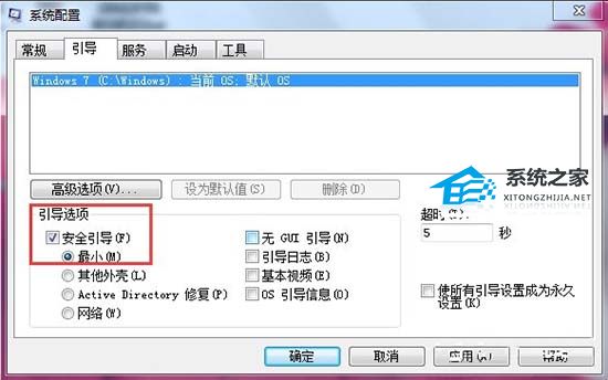 3. 从打开的“系统配置”界面中,切换到“引导”选项卡,勾选“安全引导”和“最小化”两个项目,点击“确定”按钮。