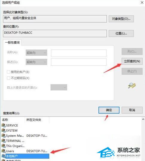 2、我们点击 更改->高级->立即查找,在下方的框框找到本地账户。点击,确认。再点击一次确认。