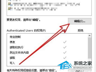 3、接下来在打开的文件夹的安全窗口中点击“编辑”的按钮。