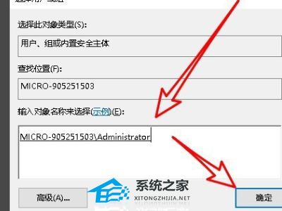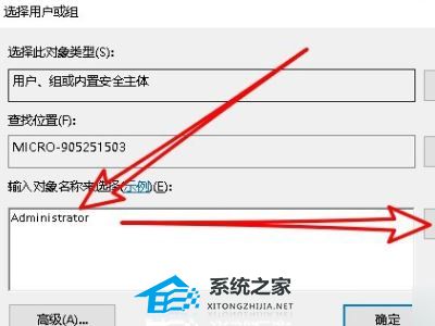 5、接下来在打开的选择用户或组的页面中,我们在输入对象名称页面中输入超级管理员的账户administrator,然后点击右侧的“检查名称”按钮。