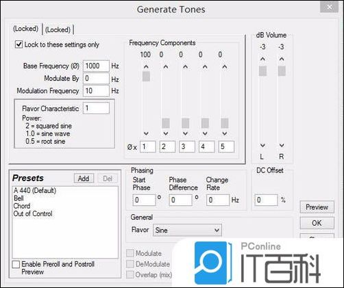 3、选择Tones后会弹出一个新对话框, 左上角可以勾选表示锁定这些设置, 先介绍勾选的情况,此时只能设置当前所看到的,Base Frequence可设置你想要的频率,通常情况下可调节dB音量,以及播放时间duration。 Flavor选择sine或者其它都可 。 测试单频通常选择sine 。