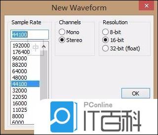 1、打开软件后, 点击File 选择下拉菜单中 New选项 ,弹出对话框,这里可以选择你要生成的音乐的采样率,是否双声道以及采样精度。