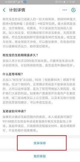 5.在保障详情界面,下滑到底部,点击放弃保障,就成功取消相互宝自动扣费了,如下图所示: