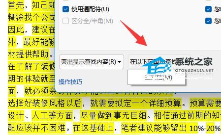 5、这时候所有文字会被突出显示,我们再选择在以下范围中查找的“主文档”。