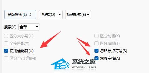 3、然后勾选下面的“使用通配符”、“忽略标点符号”和“忽略空格”。