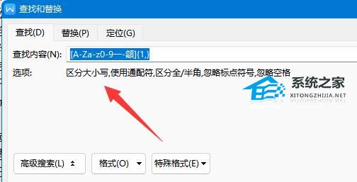 2、接着在查找内容中输入“[A-Za-z0-9一-龥]{1,}”。