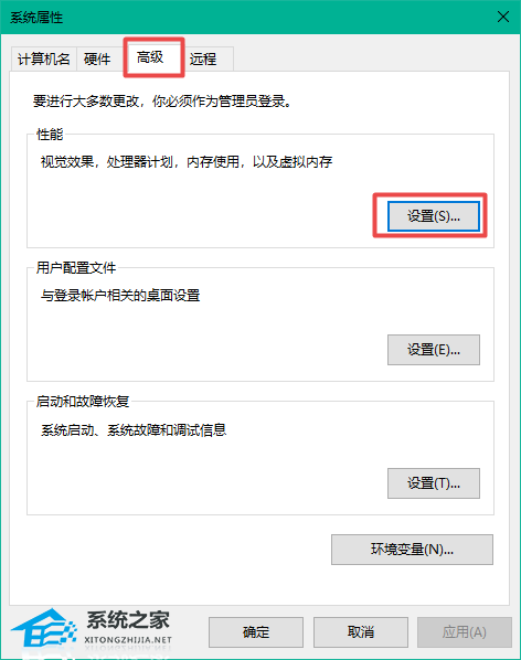 3、在出现的窗口中,点击顶部的“高级”标签栏,然后找到“性能”部分的“设置”功能。