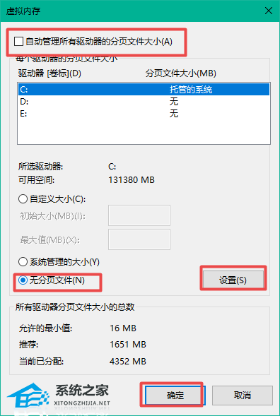 6、最后将图中的“自动管理所有驱动器的分页文件大小”取消勾选即可。
