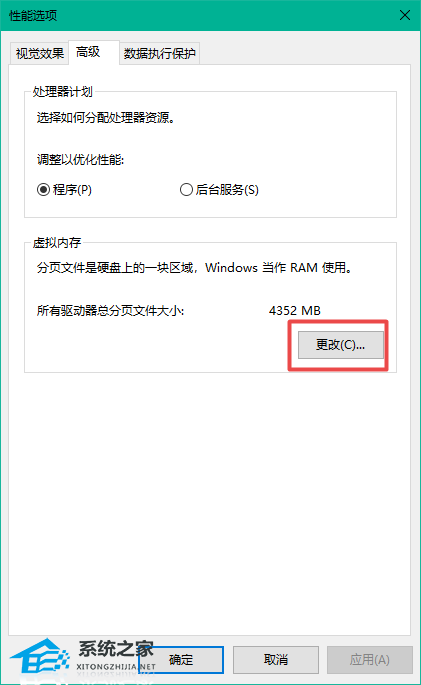 5、之后在“高级”页面中找到“虚拟内存”中选择“更改”功能。
