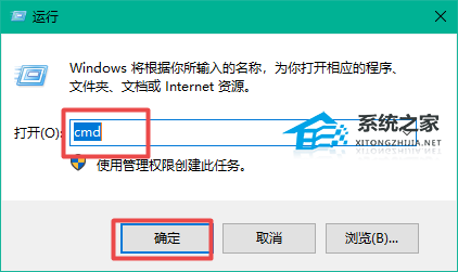 2、然后在“运行”界面输入“cmd”,点击“确定”进入命令行功能。