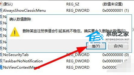 6. 接着会弹出一下确认删除的提示,点击“是”按钮就可以了。重新启动计算机后,就不会再出现右键点击桌面图标没有反应的情况了。