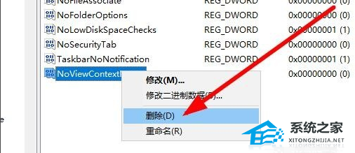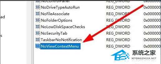 4. 在右侧的窗口中我们找到NoViewContextMenu注册表键值。