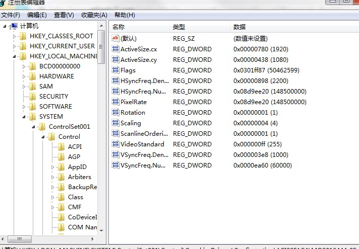 3、依次找到位置:HKEY_LOCAL_MACHINE----SYSTEM----ControlSet001-----Control-----GraphicsDrivers----Configuration。