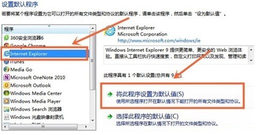 5、进入设置默认程序后,我们在此可以更改默认浏览器程序,比如我们需要将IE浏览器设置默认浏览器,那么只需要在左侧选择IE浏览器,然后在右侧操作中选择"将此程序设置为默认值"即可,如下图所示: