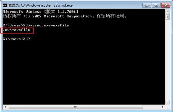 2、在打开的命令提示符光标处输入"assoc.exe=exefile"。