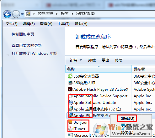 2、在这里我把后面带有apple Inc.这个尾巴的全部卸载,可以上下拖动看看有没有遗漏,再重新装刚刚下载好的ITunes软件包;