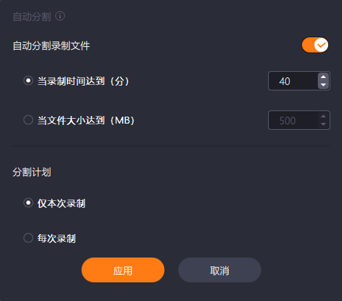 第三步:录制长视频时,可点击“自动分割”。这里可选择按照视频时长分割、按照视频大小分割。在“分割计划”中,也可选择是每次录屏都分割,还是仅限这一次。