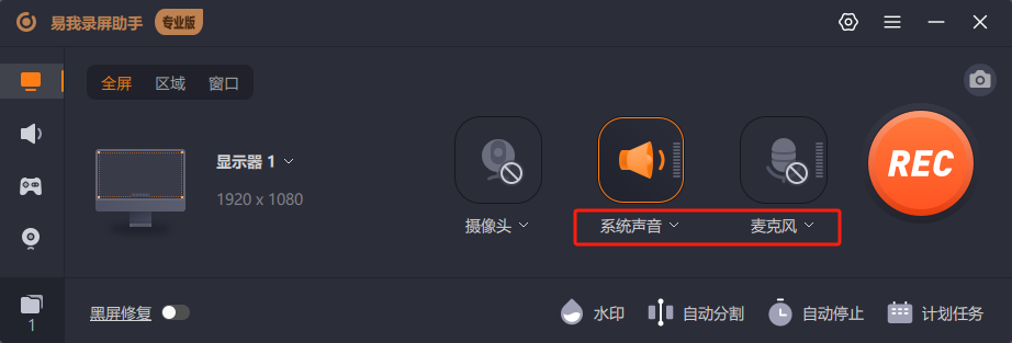 第二步:然后继续设置录屏的声音来源,这里可录制电脑系统声音以及麦克风的声音。