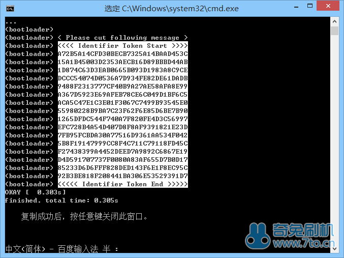 至此HTC G11 (Incredible S)手动解锁Bootloader图文教程完成。还没有学会怎么对HTC G11 (Incredible S)进行解锁的机友可以试试上面奇兔刷机在下给大家分享的这篇HTC G11 (Incredible S)手动解锁Bootloader图文教程。