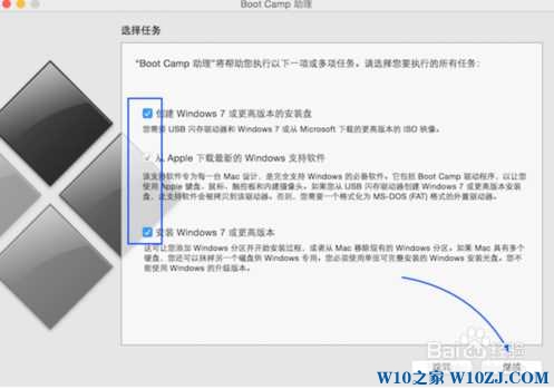 5、打开Boot Camp,然后勾选"创建Windows7安装盘"(新的macBook可能是Windows10),接着点继续;(此时你也可以勾选从Apple下载最新的Windows支持软件,也就是驱动什么的,还有勾选安装Windows或更高版本);
