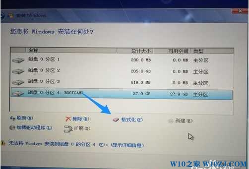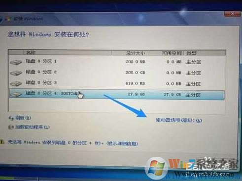 10、进入到Win7安装程序后,下一步下一步之后,来到系统分区界面,这时需要注意。在安装系统分区界面里,选择bootcamp分区并点击"驱动器高级"选项,如图所示