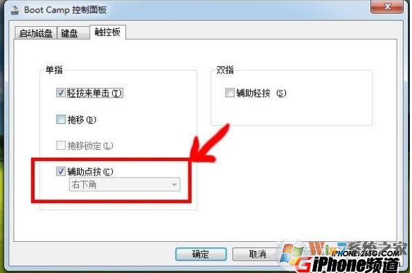4、Boot Camp支持软件也就是驱动是必须安装的,MACBook安装成Win7后,触摸板需要到右下角的Boot Camp中进行设置开启辅助点击。