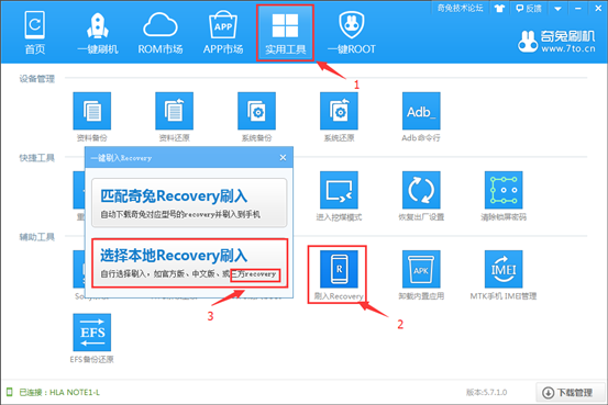 首先下载安装奇兔刷机(点击下载奇兔刷机),然后手机打开USB调试,通过数据线连接电脑,连接成功后选择找到【实用工具】,然后选择【刷入recovery】——【选择本地Recovery刷入—官方版】