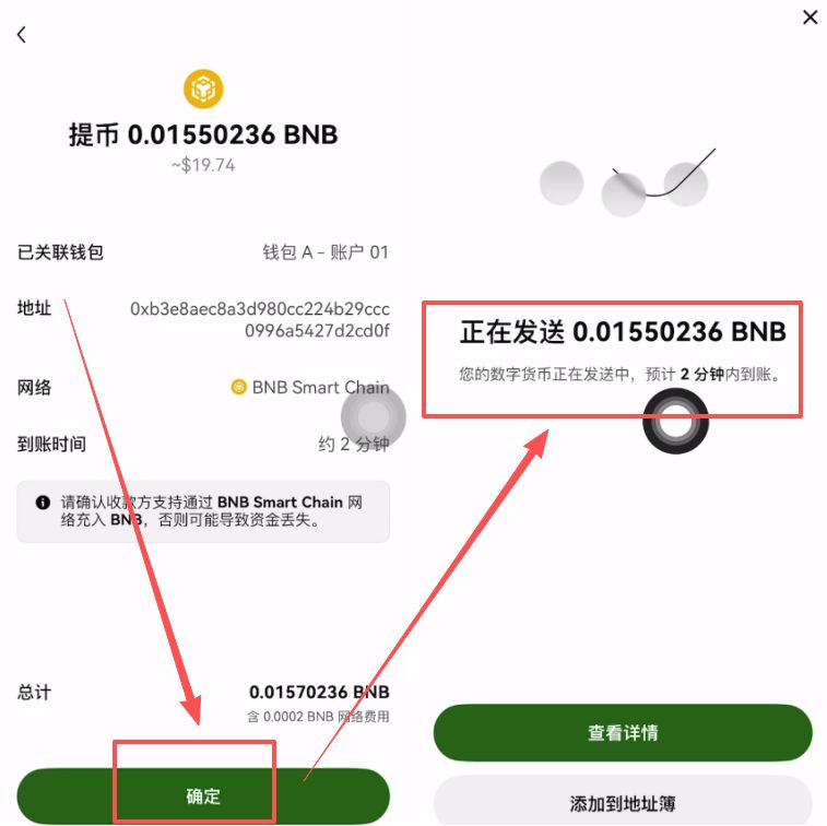 点击【确认】。它告诉我们预计两分钟之内就可以到账,我们稍微等待一下。