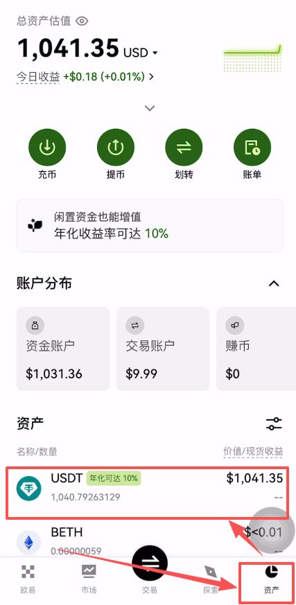 我们买好的USDT都会在资金账户里面,我们点击右下角的【资产】,在这里就可以看到我们购买好的USDT了。
