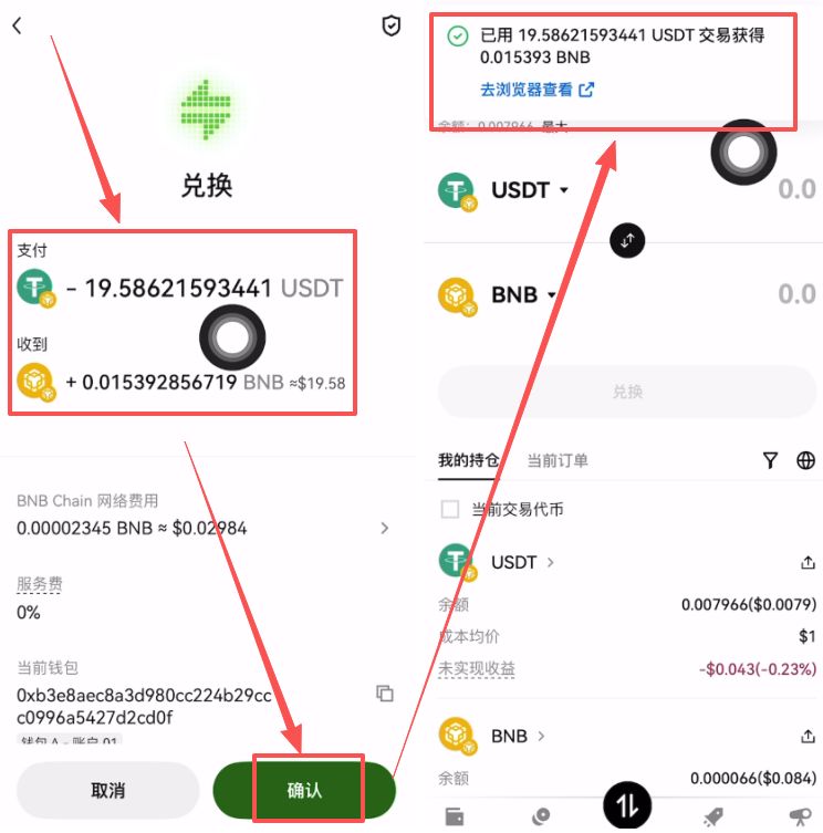 我们将BSC链上的USDT换成BSC链上的BNB,点击【确认】。可以看到已经交易成功了。