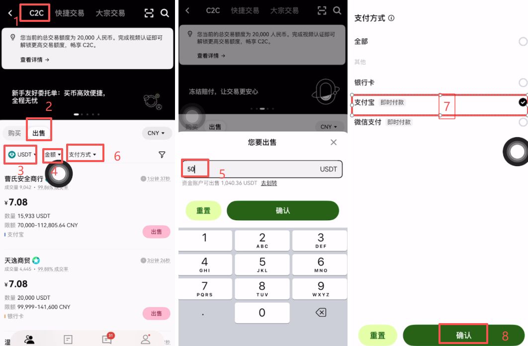 上方还是选择“C2C”交易。点击【出售】,要出售的币种同样是USDT。然后筛选一下金额,比如说我想出售50颗USDT,我就输入50。在旁边可以选择一下收款方式,同样有三种,银行卡、支付宝和微信支付。你习惯使用哪个就选择哪个,比如说我还是选择“支付宝”,点击【确认】。