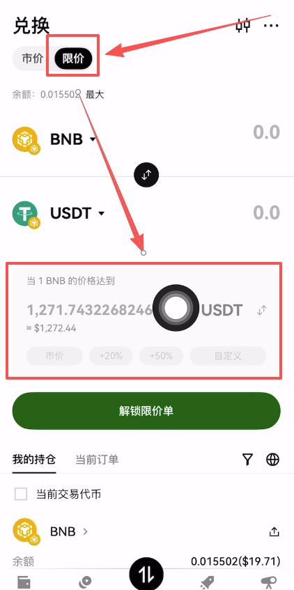 在下方“我的持仓”这里可以看到,我的USDT已经换成了BNB了。
