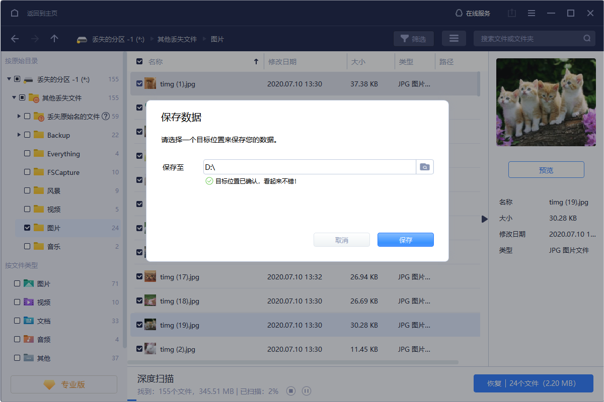 从扫描列表中勾选需要恢复的数据,点击右下角「恢复」按钮,选择需要保存的位置,等待数据成功恢复。注意:切记不要将需要恢复的数据保存到源盘,请务必选择其它盘或者外置盘进行保存。