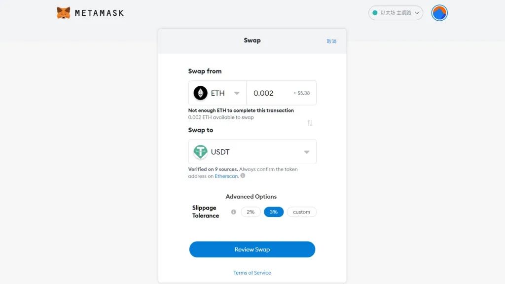 在这画面,你可以选择你想兑换的币种,下面的 Slippage Tolerance 则是滑点容忍度,建议直接使用预设值,完成后点选 Review Swap