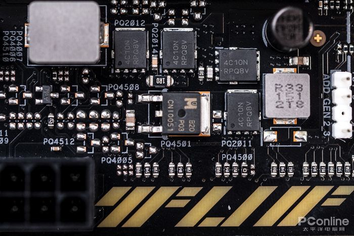 24Pin供电接口旁是TUF字样的RGB灯光Logo,在不亮灯的情况下显示为黄色。