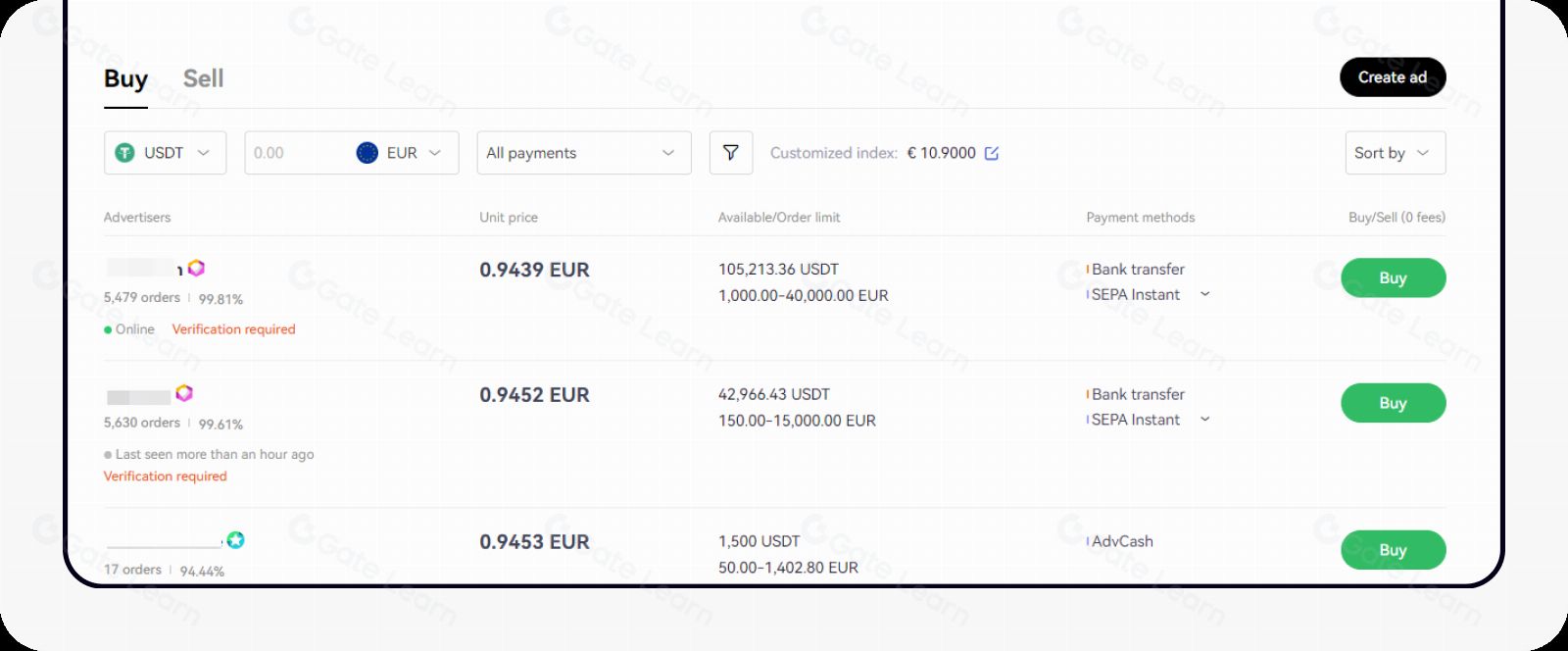 用户设置帐户后,下一步就是浏览平台上上线的币种,为购买加密货币或出售其资产做准备。作为买家,您可以浏览币种并找到提供的要求最适合您的卖家。作为卖家,您可以在不与交易所规则和规定相冲突的情况下设置您的首选要求。