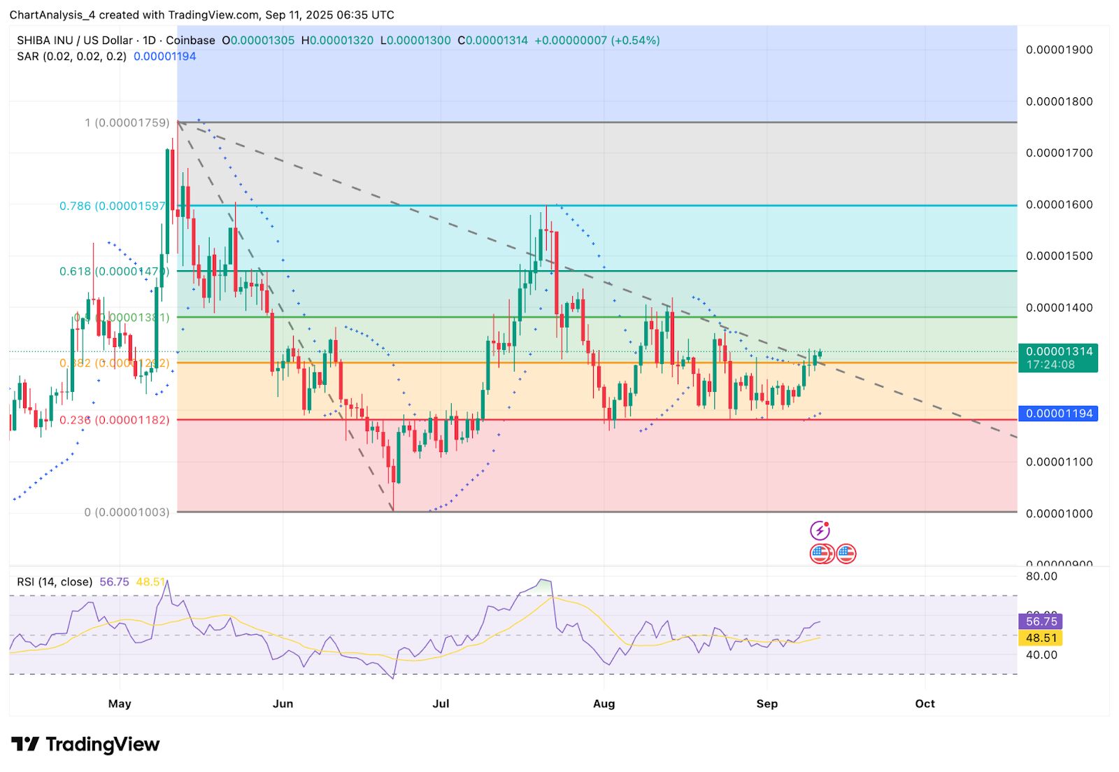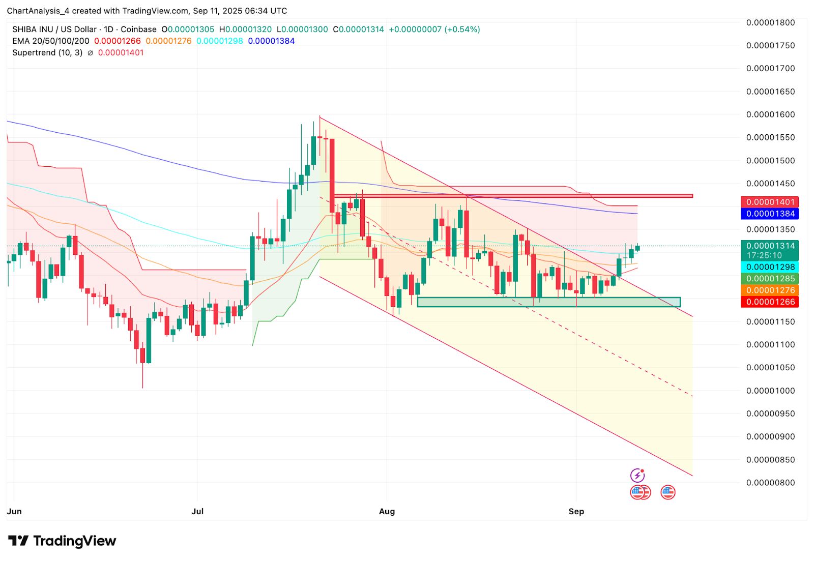 今日柴犬价格在 0.00001314 美元附近交易,在收复 0.0000128 美元支撑位后盘整。此举标志着两周以来最强劲的反弹,交易员正在权衡技术面压力与谨慎的链上资金流动。