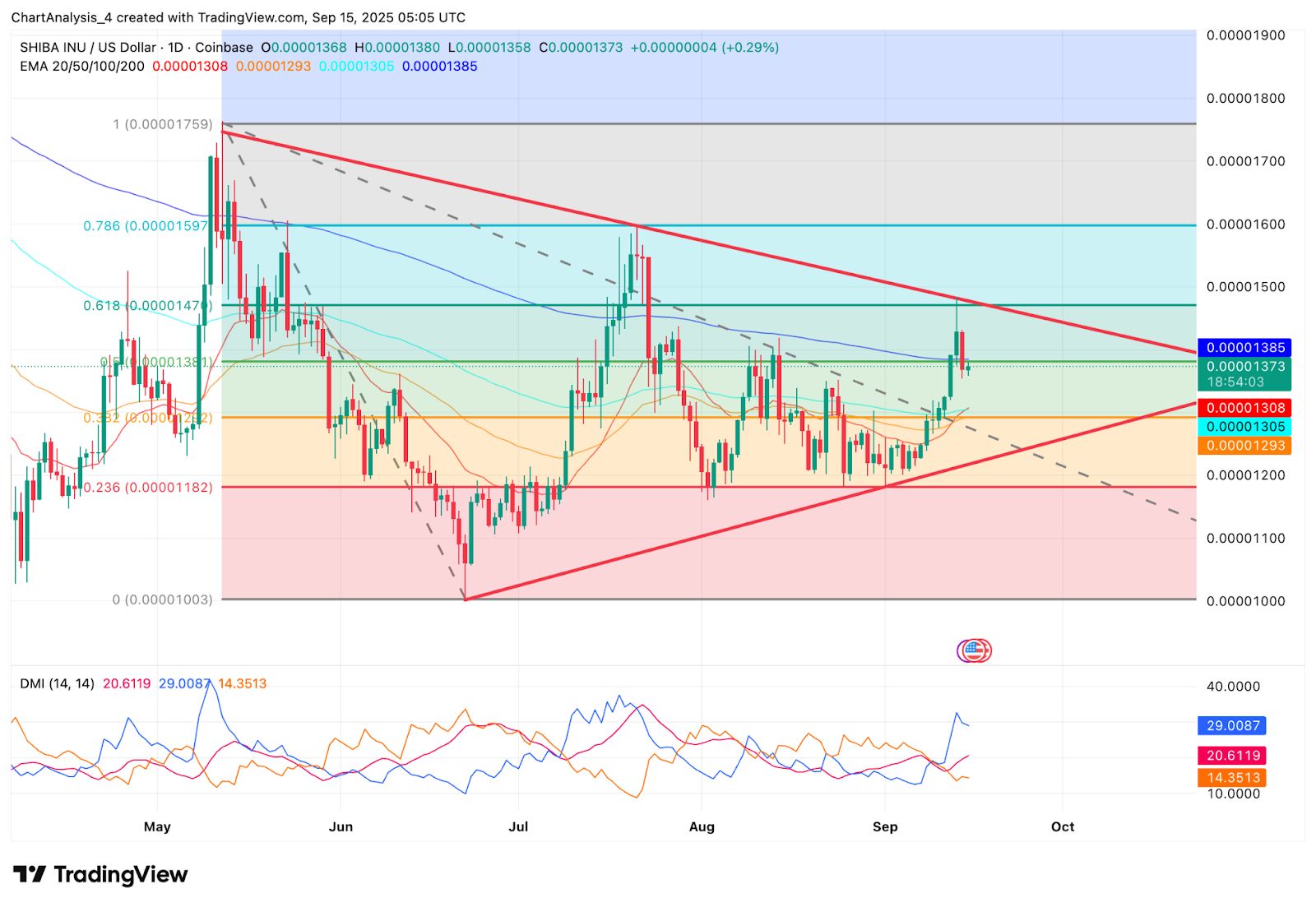 柴犬 (SHIB) 价格今日交易价约为 0.00001373 美元,此前该代币曾大幅上涨至其数月楔形的上轨。近期,该代币曾触及 0.00001450 美元,随后遭遇阻力。交易员目前关注的是,SHIB 的动能能否推动其突破这一供应区间,还是将进入盘整阶段。