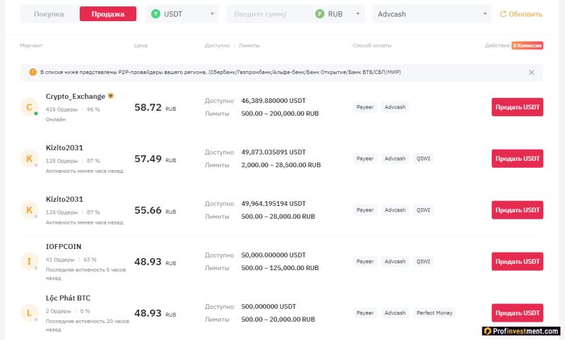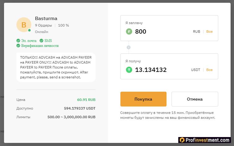 没有佣金,需要交易者的验证。超过两打的世界法定货币和多种转账方式被用作支付方式。您所需要做的就是找到接受您方便的付款方式的商家的报价。大多数商人与 Sber、Tinkoff、Qiwi(如果我们谈论的是卢布)合作。