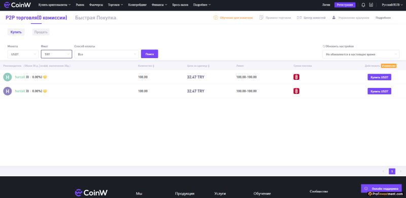 CoinW是一家在圣文森特和格林纳丁斯注册的相当古老的加密货币交易所,最近开始在独联体市场积极推广自己。它支持p2p兑换的可能性,但在撰写本文时,这个方向的流动性非常低,许多货币几乎没有广告。
